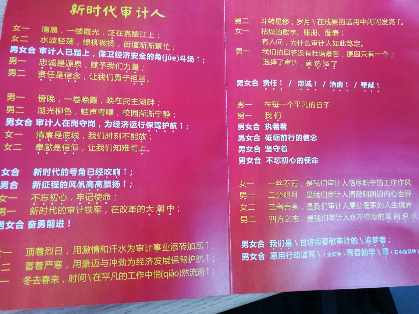 2018年6月28日,审计处参加机关党委“不忘初心、争创一流,我为党旗添光彩”诗歌朗诵比赛,全体审计人员用饱满的激情和豪迈的气势,热情诵读一首原创诗歌“新时代审计人”,获得好评并收获三等奖。